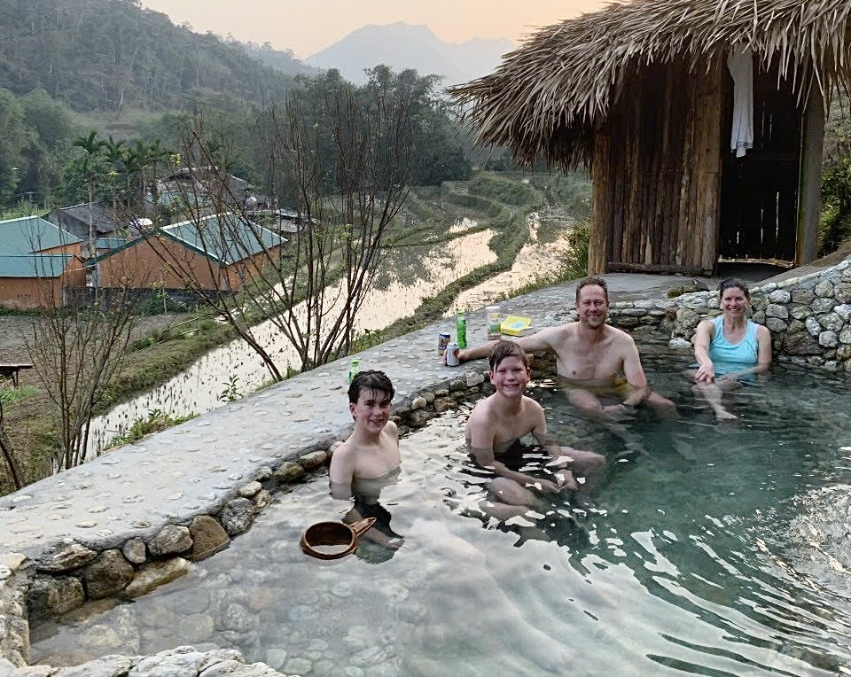 13h30 : Visite du village de Thông Nguyên. Vous traverserez de magnifiques rizières en terrasses et longerez un ruisseau pittoresque à travers le village de Nậm Ty. Vous visiterez Làng Giàng, un village paisible avec de vastes rizières, des maisons sur pilotis anciennes et des buffles paissant tranquillement. Vous pourrez aussi profiter d’un bain onsen dans une source chaude au bourg de Thông Nguyên.