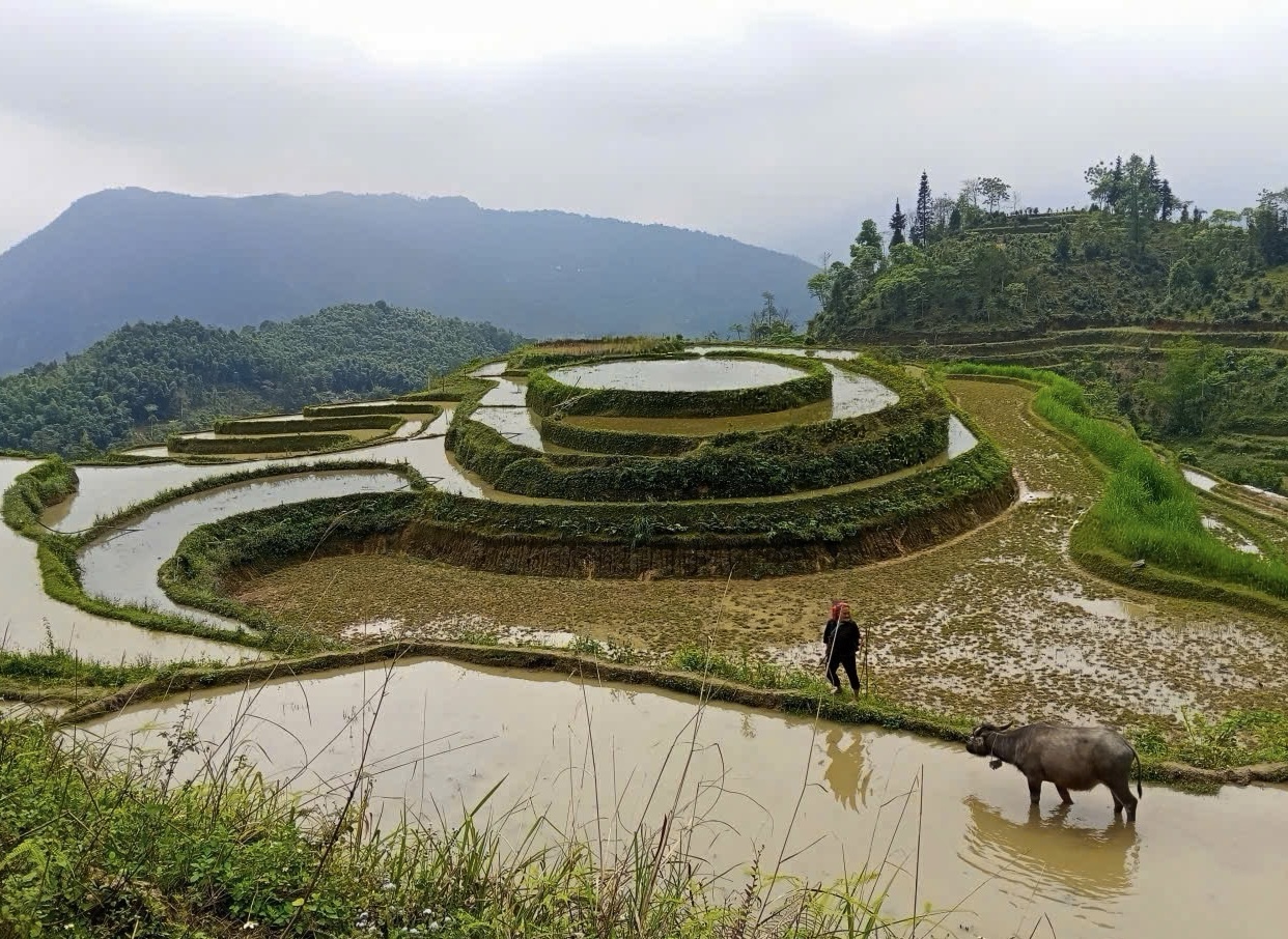 Au lieu des champs jaunes de la récolte, vous découvrirez des rizières remplies d’eau, des courbes douces dessinées par les terrasses et des scènes de vie agricole très vivantes. Les habitants commencent à préparer une nouvelle saison de culture : ils réparent les digues, conduisent l’eau vers les champs, travaillent avec les buffles et préparent les jeunes plants de riz.