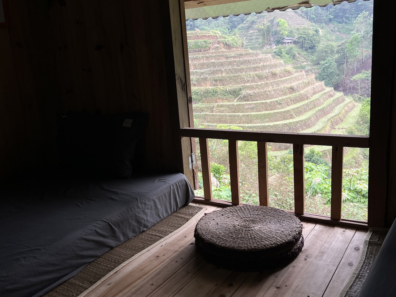 Nam Ly Retreat Stilt House Family Room for 4 guests, occupying the entire second floor with 2 connected rooms, a private bathroom outside, ideal for families or small groups seeking privacy and comfort. The space stands out for Black Dao ethinic traditional stilt-house architecture, natural wooden interiors, and a spacious shared living area overlooking the beautiful terraced rice fields right in front of the house. Here, guests can enjoy modern comfort while also experiencing the authentic charm of local culture in a unique and character-filled setting.rooms